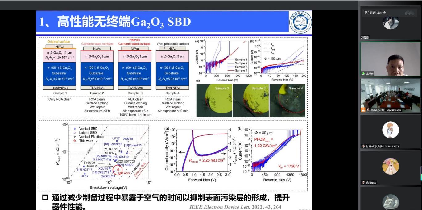 龙士兵教授从基础的理论知识出发,介绍了氧化镓的材料特性、应用领域与国内外研究现状;在简要总结氧化镓材料在功率器件及日盲紫外探测领域的重要应用意义后,系统介绍了其课题组在氧化镓功率器件及光电探测器件方面做出的创新性工作:通过控制Ga2O3表面洁净度,实现了高性能无终端Ga2O3SBD;利用Ga2O3的热氧化高阻特性,设计并制备出热氧终端SBD,击穿电压达到1800 V;针对Ga2O3难以实现P型掺杂问题,引入p型NiO材料,研制NiO/Ga2O3异质PN结二极管,并通过退火优化界面提高器件性能;进一步采用结终端扩展结构(JTE)及退火工艺实现结终端高耐压及高耐温PN结二极管;此外,基于低成本的非晶GaOX,通过缺陷与掺杂工程设计实现了极端环境下(高温、高压、高能辐照)依然表现超高灵敏度的日盲探测器;从材料及结构方面对探测器进行设计,实现了不同类型的高性能Ga2O3日盲紫外探测器;针对探测阵列成像应用,设计了探测阵列并实现了清晰地日盲成像验证等。