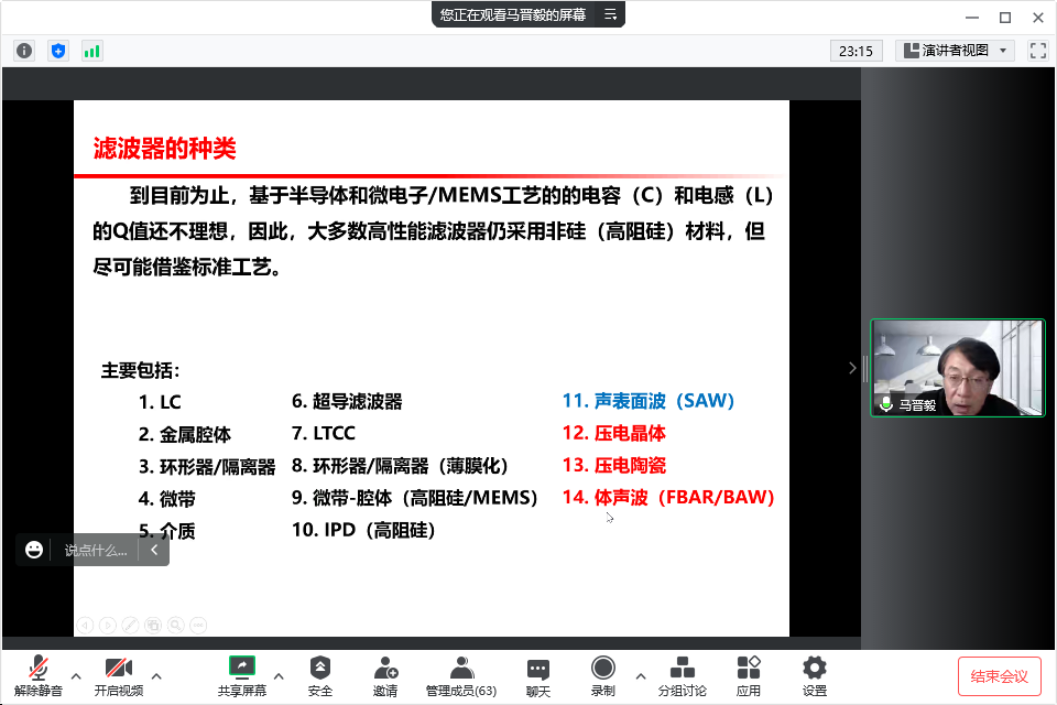 马晋毅首先向在座师生简要介绍了微声电子技术,并从滤波器种类及微声滤波率体积优势等方面出发,阐述了微声滤波率在移动通信中的作用,进而将材料与器件相结合,阐述了压电材料在微声滤波器中的重要作用。报告梳理了SAW器件的两次应用高潮和性能优化方向,举例了不同材料在优化滤波器性能中发挥作用的优势与方式。报告最后立足材料与器件的密切联系,总结了未来材料必然走向高性能、薄膜化、功能复合化的趋势。