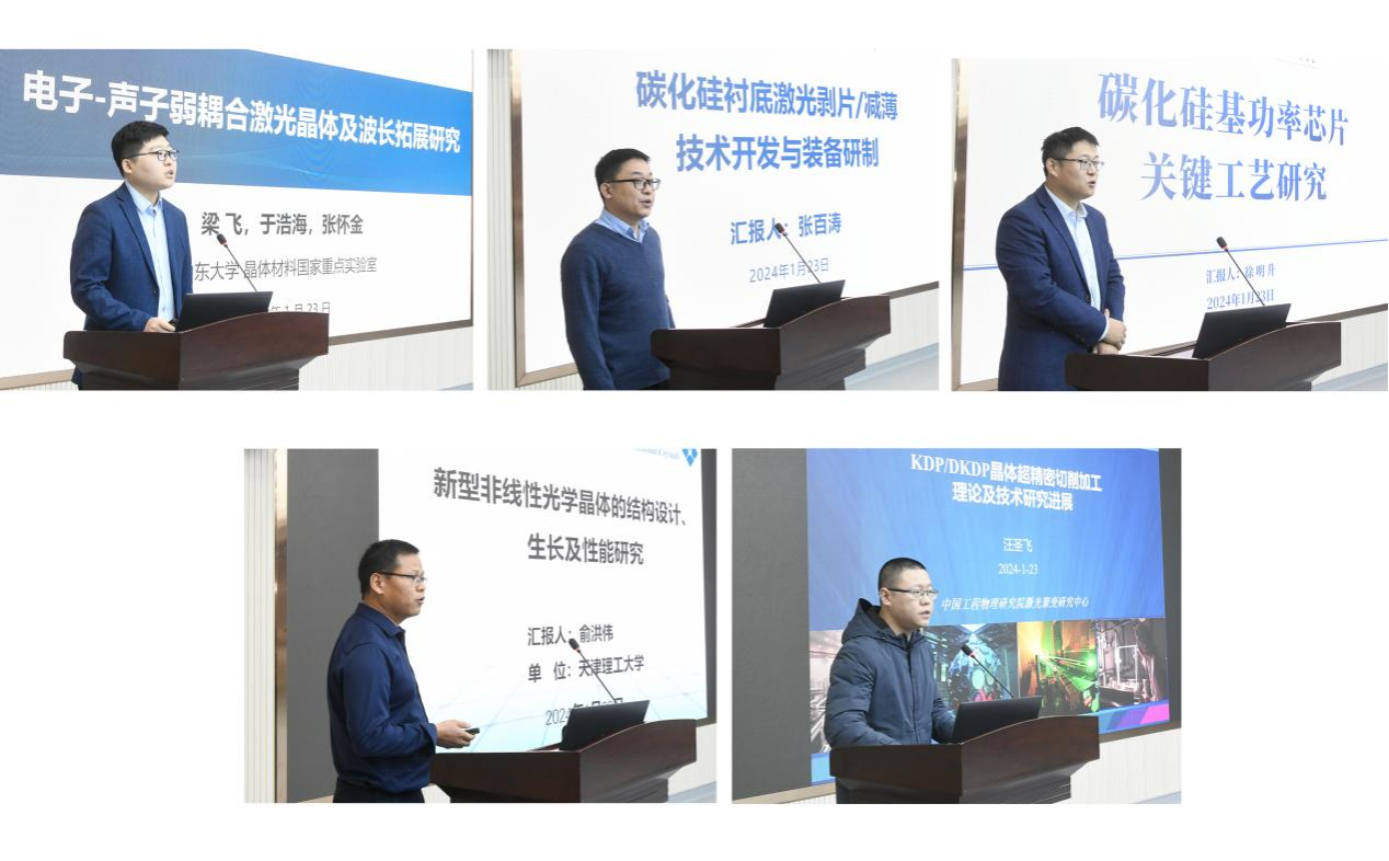 实验室骨干梁飞、张百涛、徐明升,天津理工大学俞洪伟、中物院激光聚变研究中心汪圣飞依次作《电子-声子弱耦合激光晶体及波长拓展研究》《碳化硅衬底激光剥片/减薄技术开发与装备研制》《碳化硅基功率芯片关键工艺研究》《新型非线性光学晶体的结构设计、生长及性能研究》《KDP/DKDP晶体超精密切削加工理论及技术研究进展》等代表性成果报告,介绍团队最新科研进展。报告结束后,与会院士、专家进行交流讨论,聚焦国重重组重点任务,为实验室高质量发展找问题、把方向,明确未来发展目标,提出了具有针对性、指导性的意见建议。