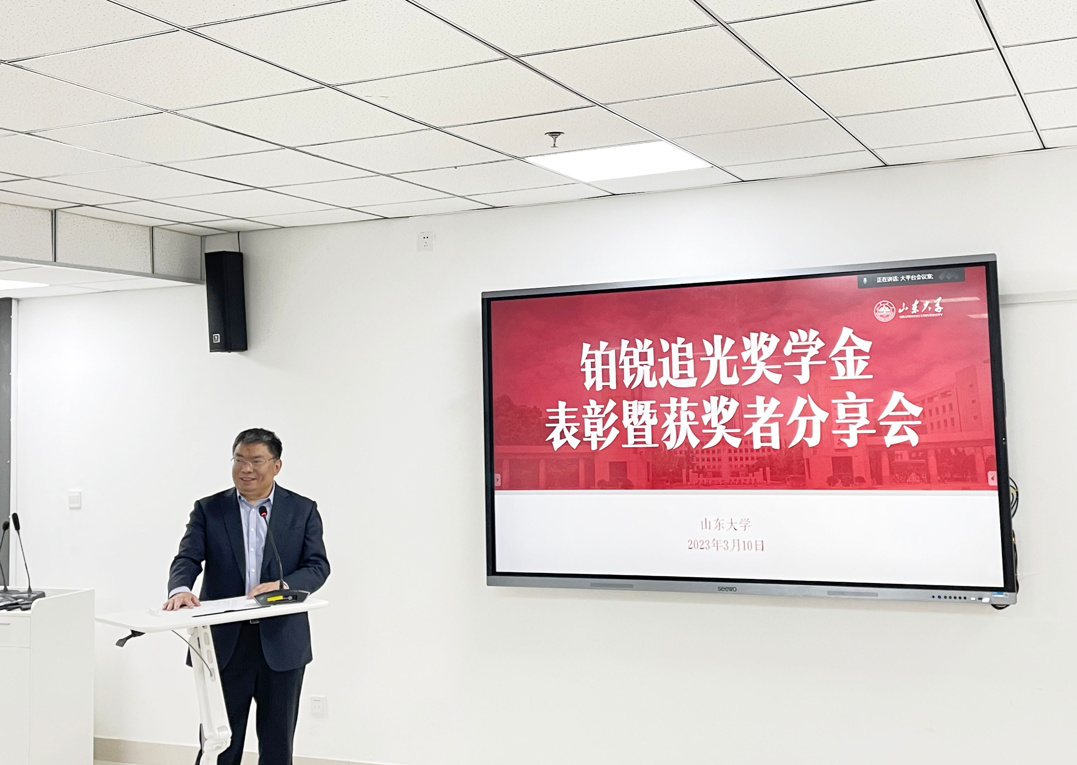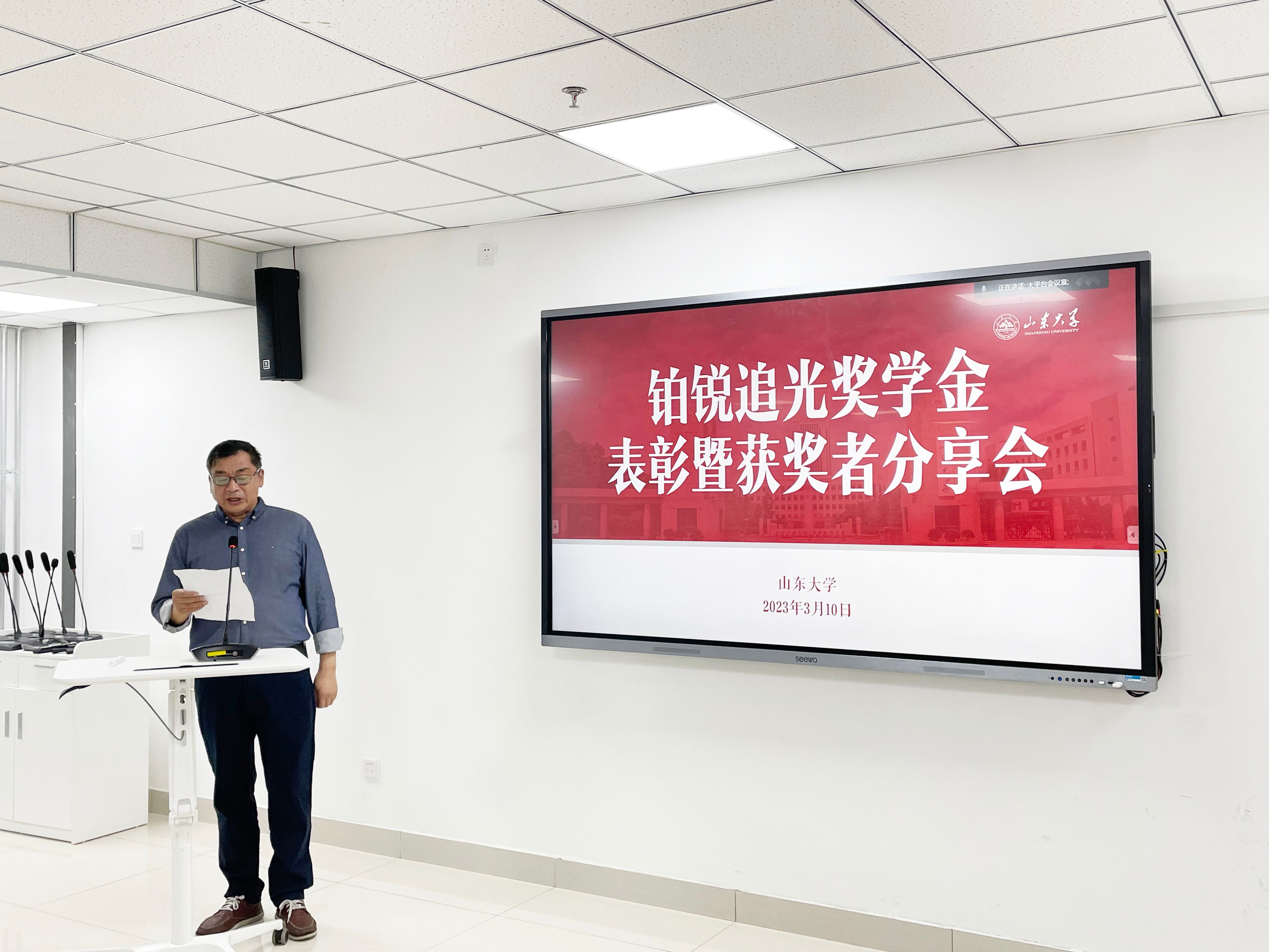 院长徐现刚教授出席会议并致辞。铂锐追光奖学金推动者何京良教授,部分教师代表,首期奖学金获奖学生,部分学生代表参加会议。会议由副院长王焕杨主持。
