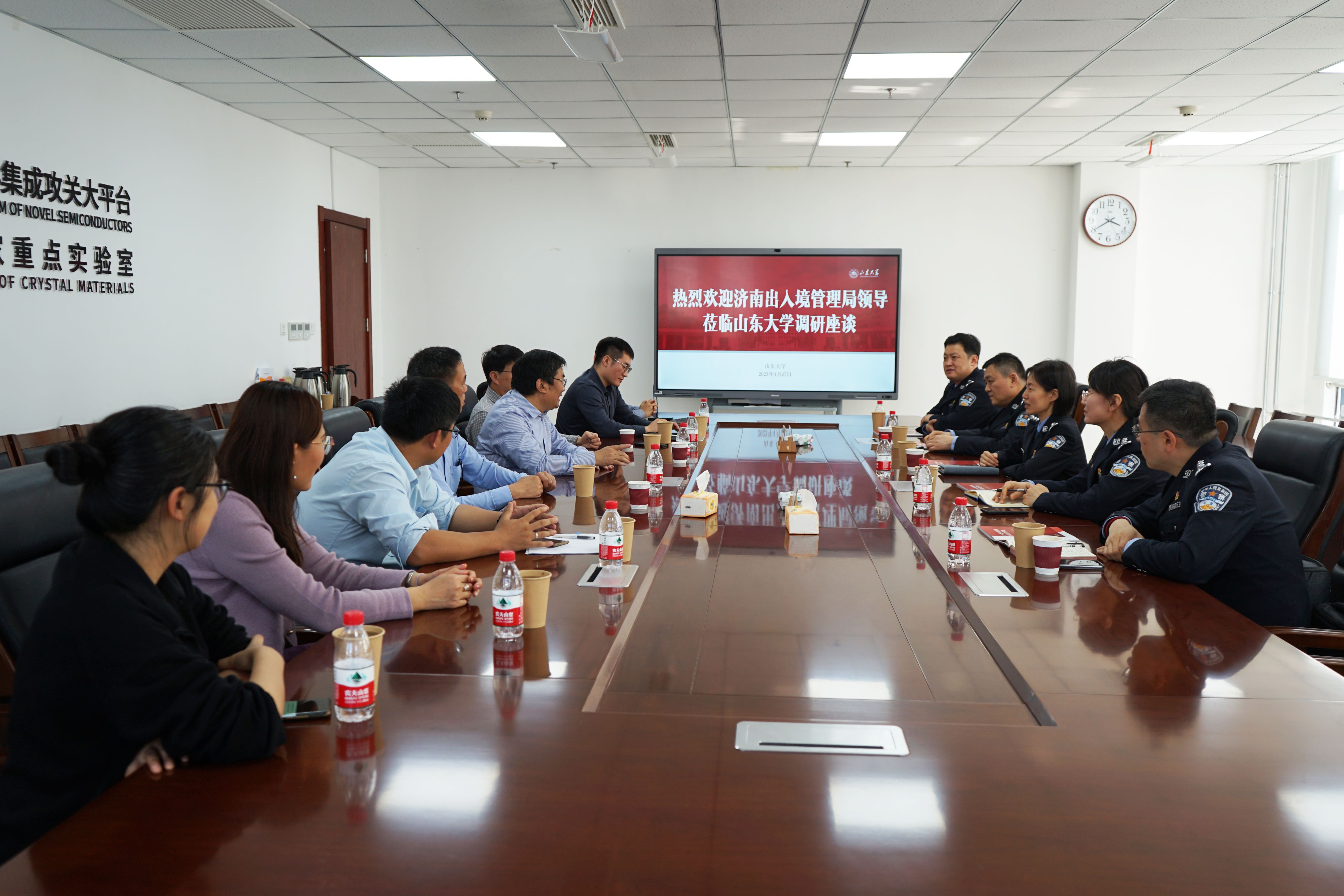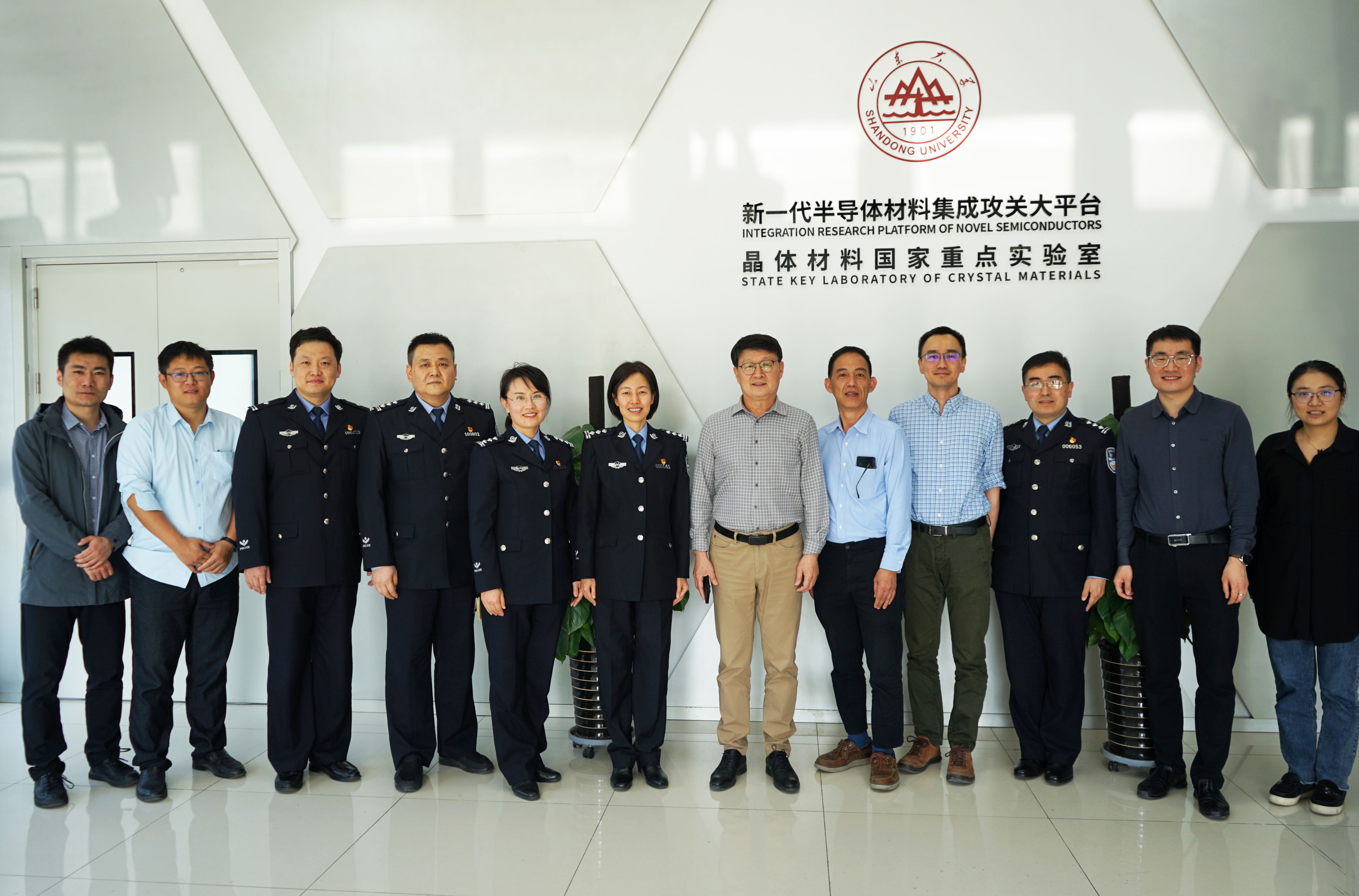 4月27日,济南市公安局出入境管理局领导专家一行来访新一代半导体材料集成攻关大平台,大平台主任徐现刚、副主任王焕杨作相关讲解。集成攻关大平台特聘教授韩吉胜、特聘教授Handoko LINEWIH及新一代半导体器件团队部分教师学者陪同调研座谈。