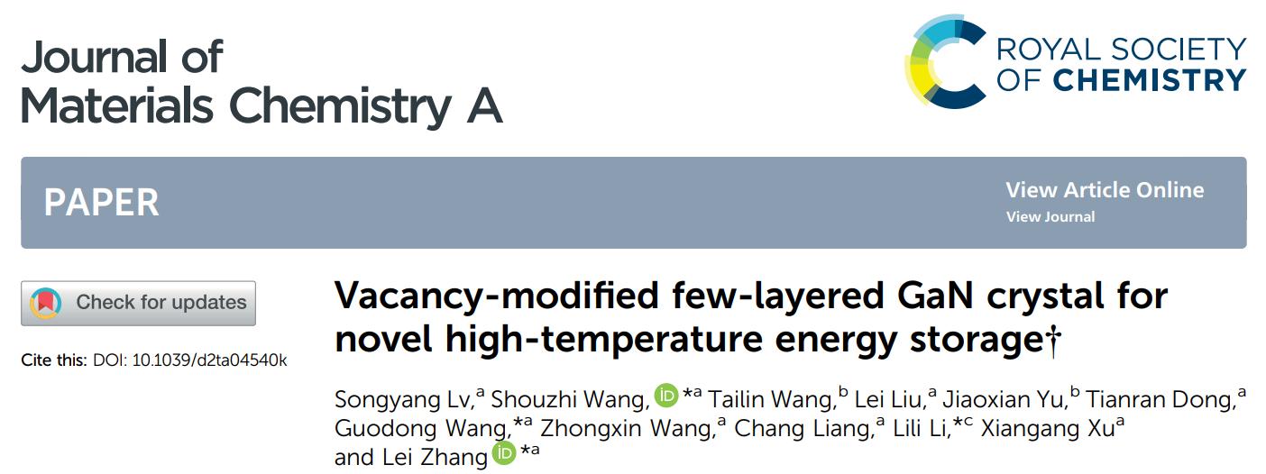 氮化物任务组,实现了GaN晶体储能器件在150℃高温环境下稳定工作。研究成果以“Vacancy-Modified Few-Layered GaN Crystal for Novel High-Temperature Energy Storage”为题,发表在国际期刊Journal of Materials Chemistry A (IF:14.51)上。博士生吕松阳为第一作者,王守志、王国栋、张雷为共同通讯作者,h图书馆