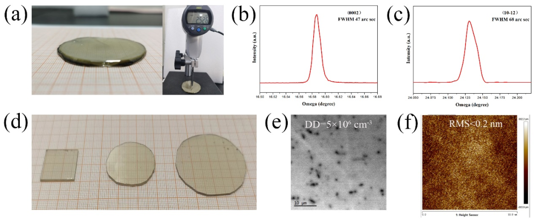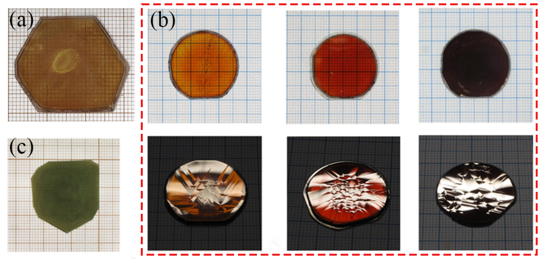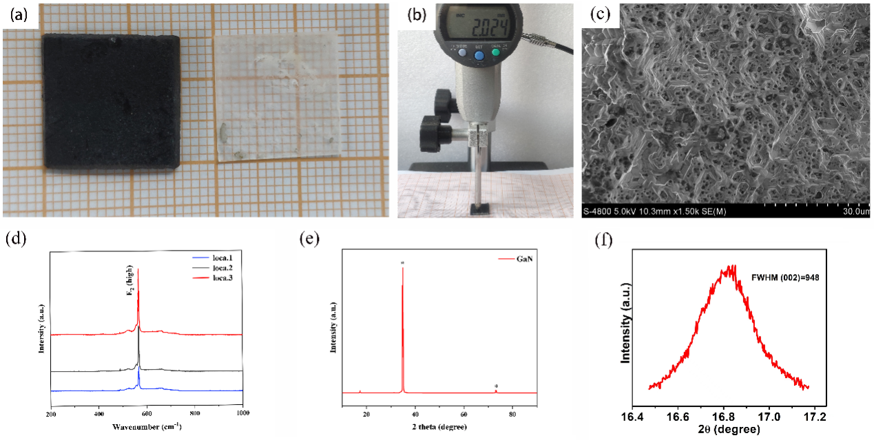 图3:钠助熔剂法生长获得的15×15 mm氮化镓晶片(a)GaN片及其测试结果