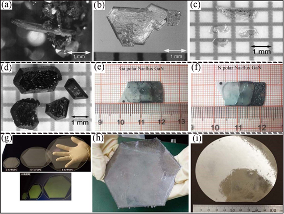 相比于第一代和第二代半导体材料,第三代半导体材料具有更高的击穿场强、电子饱和速率、热导率以及更宽的带隙,更加适用于高频、大功率、抗辐射、耐腐蚀的电子器件、光电子器件和发光器件的制备。氮化镓(GaN)作为第三代半导体材料的代表之一,是制作蓝绿激光、射频微波器件和电力电子器件的理想衬底材料,在激光显示、5G通信、相控阵雷达、航空航天等方面具有广阔的应用前景。氢化物气相外延(HVPE)法生长速度快,易制备大尺寸GaN单晶,且光电性能易于控制,因此HVPE是目前应用最为广泛也最有前景的GaN单晶生长方法。钠助熔剂(Na-Flux)法生长GaN单晶的条件温和,易获得高质量、大尺寸的GaN单晶,也是一种具有广阔商业化前景的GaN单晶生长方法。