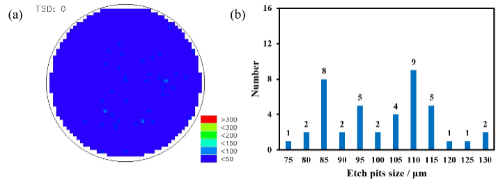 与南砂晶圆于2022年实现了低微管密度高结晶质量的8英寸导电型4H-SiC单晶和衬底的制备,近期在8英寸SiC衬底位错缺陷控制方面取得了重大突破,实现了近“零TSD”和低BPD密度的8英寸导电型4H-SiC单晶衬底制备。图1(a)所示为制备的8英寸导电型4H-SiC单晶衬底,使用熔融KOH对衬底进行选择性蚀刻,统计BPD和TSD对应的特征腐蚀坑数量,计算BPD和TSD密度。图1(b)为衬底的BPD密度分布图,平均BPD密度为202 cm-2。图2(a)给出了TSD密度分布图,平均TSD密度<1 cm-2。图2(b)为不同尺寸TSD腐蚀坑对应的数量,其中TSD数量总计42个,测试点数1564个,每个点对应面0.0489cm2,因此TSD密度=42 / (1564×0.0489cm2)=0.55 cm-2。
