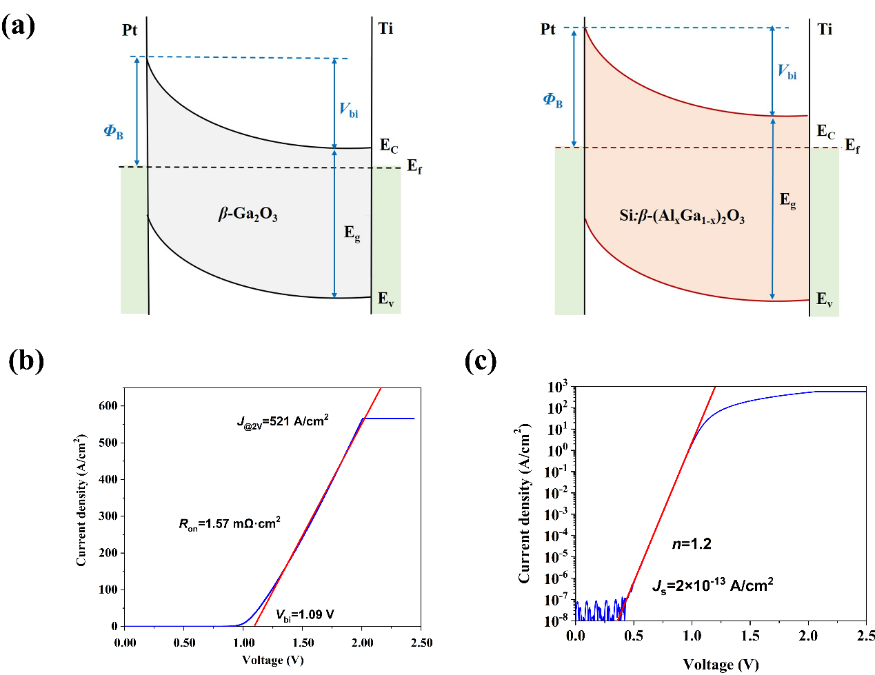 穆文祥,中科大龙世兵),该论文基于能带工程和杂质工程,设计生长了具备宽带隙、低电阻的Si掺杂β-(AlxGa1-x)2O3单晶,并进一步制备了肖特基二极管,成功验证了Si掺杂β-(AlxGa1-x)2O3基二极管高肖特基势垒、低导通电阻的优异电学特性。