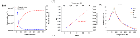 如图5所示,晶体载流子浓度和电阻率与温度的关系遵循热激活行为。300 K时载流子浓度达到4.61×1018cm-3。电阻率降低到0.099 Ω·cm。使用阿伦尼乌斯方程计算的晶体活化能如图5(b)所示。在75-150 K范围内,存在一个14.2 meV的活化能,与Si的活化能一致。此外,我们还系统的分析了散射机制对电子迁移率的影响。发现在100 K以上,光学声子散射是影响迁移率的主要因素,在50 K以下,电离杂质散射占主导地位。