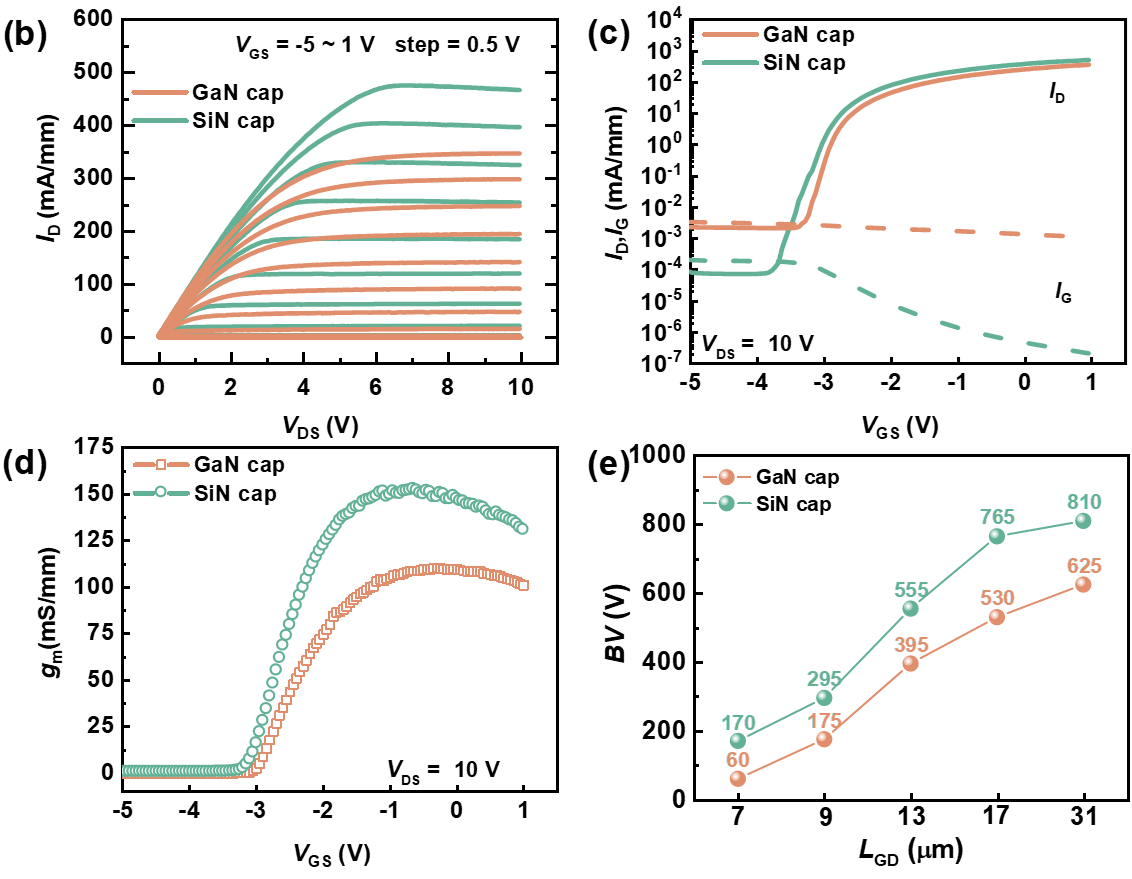 栅介质层是场效应晶体管的重要组成部分,常规栅介质层以氧化物或氮化物非晶材料为主,这导致非晶介质层和单晶半导体之间很难形成原子层级的平坦界面,从而产生大量的界面电荷,对器件的关态漏电、输出电流、击穿电压和可靠性等产生巨大影响。由于栅介质层和沟道半导体材料之间大的晶格失配和热失配,使得栅介质层的单晶生长成为一直以来的难题。针对该问题,团队利用原位生长技术,首次在AlGaN势垒层上生长出2nm晶态SiN帽层,实现了GaN器件上单晶介质层生长技术的突破。通过HRTEM、XPS等多种表征手段确定所生长的SiN晶体结构为缺陷纤锌矿结构(DW-SiN),其与AlGaN具有更加优异的界面质量,有效地将界面态密度降低1个数量级。与传统器件相比,具有晶态SiN帽层的GaN器件表现出更高的电子迁移率(1552cm2/V∙s,提高21%)、更大的输出电流(493 mA/mm,提高41%)、更大的开关电流比(7.29×106,提高1个量级)以及更高的跨导(152 mS/mm,提高38%)。得益于优异的界面特性和单晶质量,该SiN单晶生长技术有效地抑制了器件中的尖峰电场分布,成功地将GaN器件的击穿电压从625V提升到810V,实现了30%的提高。此外,SiN采用原位生长,可省略器件制备中的介质层沉积工艺,从而简化工艺流程,节约生产成本。这种晶态SiN介质层生长技术,显著提高了器件的输出电流和击穿电压,降低了器件的生产成本,在GaN功率开关和高功率微波等领域具有重要的应用潜力。