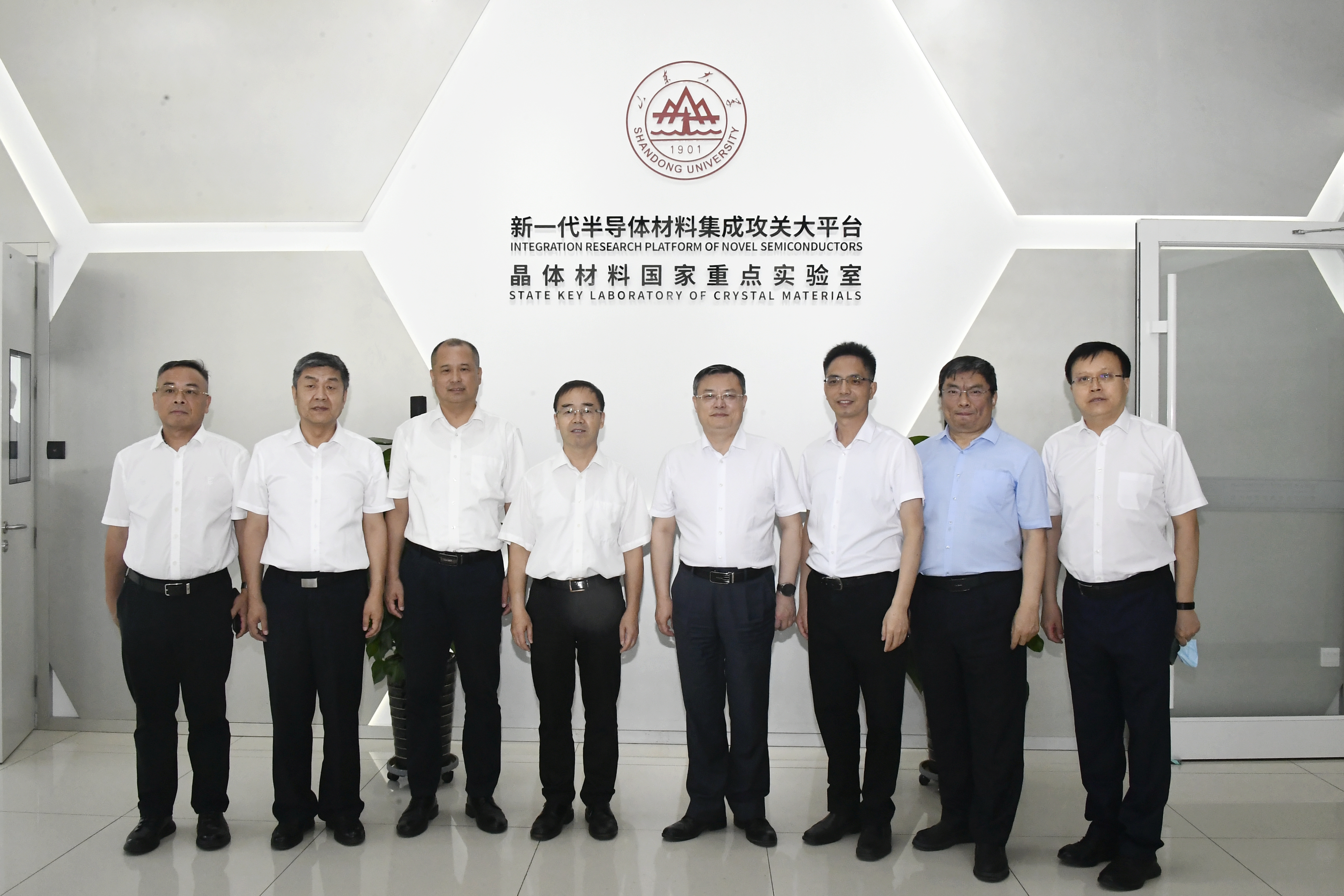 6月6日,厦门大学党政代表团来h图书馆 新一代半导体材料研究院调研。学校党委副书记王君松,晶体材料国家重点实验室主任、新一代半导体材料研究院院长徐现刚,晶体材料研究院党委书记曲刚、常务副院长于浩海陪同调研。