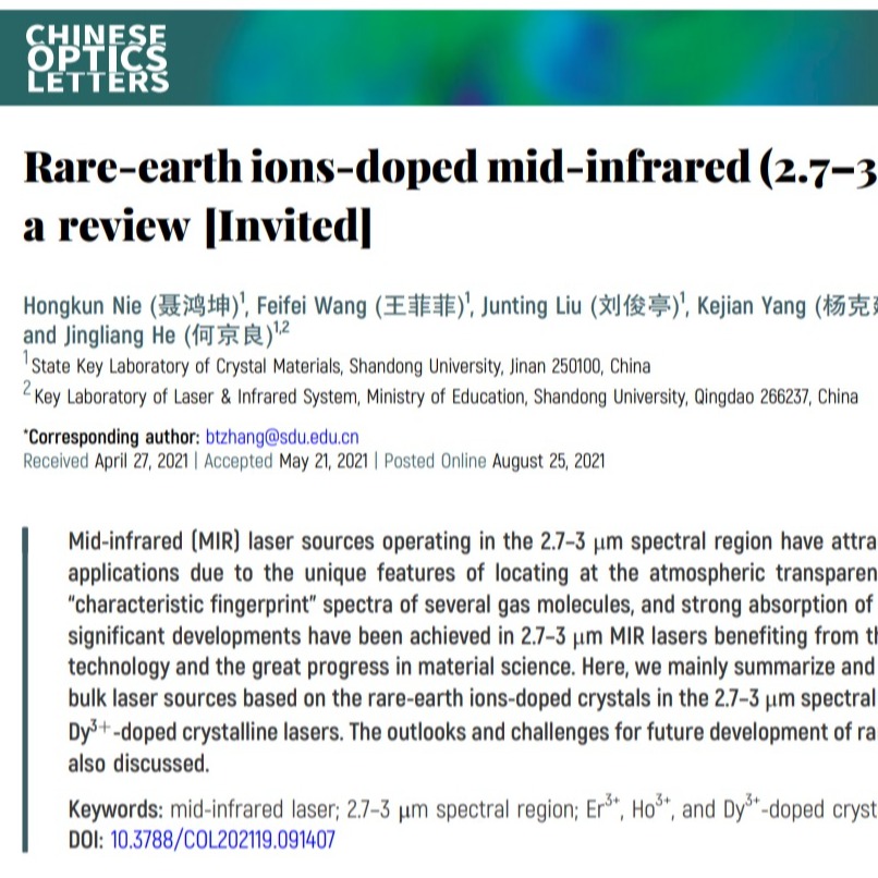 近日,张百涛、何京良教授课题组综述了基于Er3+、Ho3+和Dy3+离子掺杂晶体的2.7-3μm波段中红外固体激光的研究现状,系统地介绍了稀土离子掺杂晶体中红外固体激光的关键技术和研究进展,...